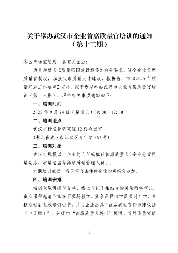 關于舉辦武漢市企業(yè)首席質(zhì)量官培訓的通知(第十二期)